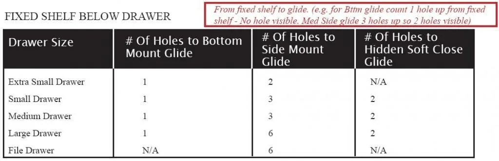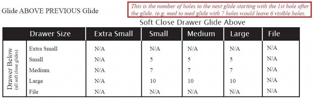 The slide placement for bottom mount slides and side mount slides will line up with the gable line boring, however, only the front hole on under mount soft close slides will line up with the gable holes. To mount soft close slides it is necessary to mount the front of the glide to the gable using a euro screw. Tighten the screw enough so the slide will not drop down when you let go of it. Next, use a carpenter square along the front edge of the gable with the tail of that square coming up underneath the soft close slide. Once the slide is square to the front edge choose one of the back holes and drill a 5mm hole.