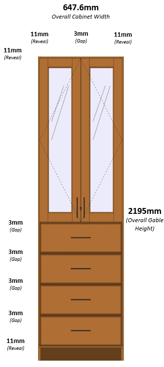 Every cabinet is made up of stacked components: kick (toe kick), reveals, drawer fronts, gaps, doors, and top/bottom structural parts. When you add together the exact measurements of each piece—including every reveal and gap—you arrive at the cabinet’s total gable height.